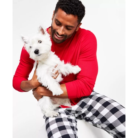 A solid top and Buffalo check jogger pants keep him in cozy style with Family Pajamas’ thermal set.