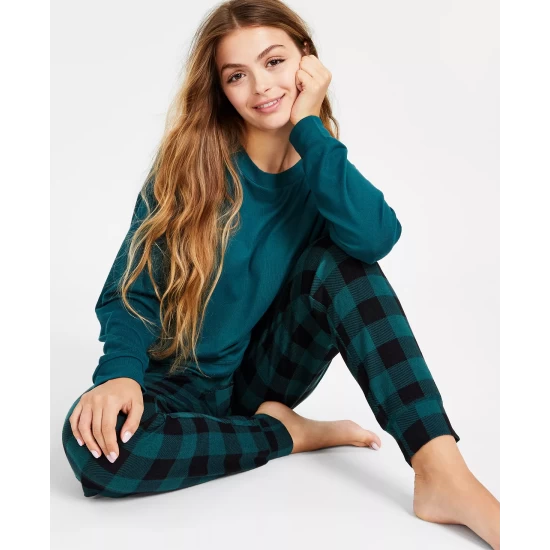 - Bottom: hits at ankle; approx. inseam: 30-1/2″; waffle-knit fabric; elastic waist