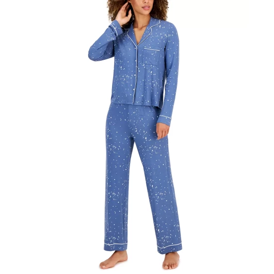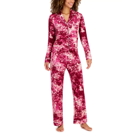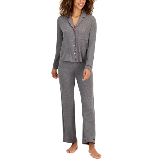 Piping trim adds dressed-up stye to this comfy notch-collar top and matching pants pajama set from Jenni.