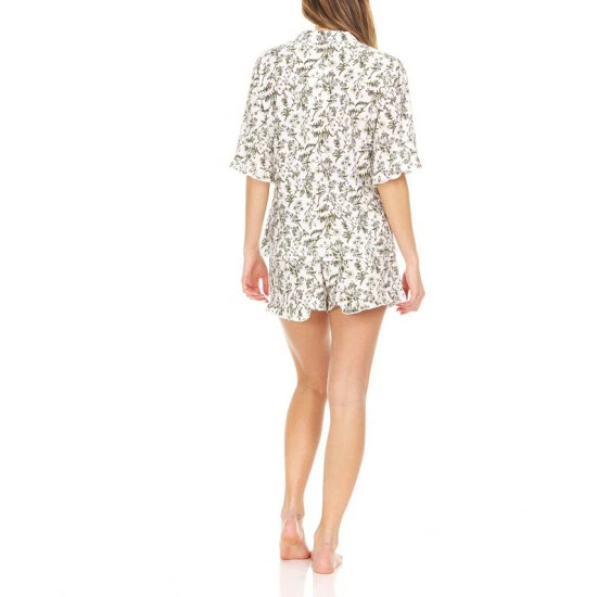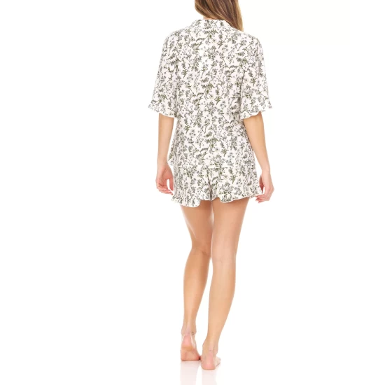 The button-up top features a mandarin collar and a longer sleeve length with ruffle detail, while the bottom is of short length in the same ruffle detail.