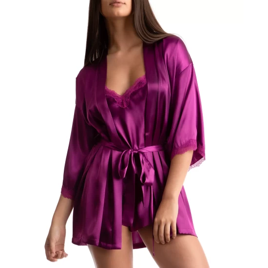 Add some flirty style to your nights with this satiny-soft three piece set from Linea Donatella featuring a wrap robe, cami and shorts.