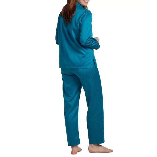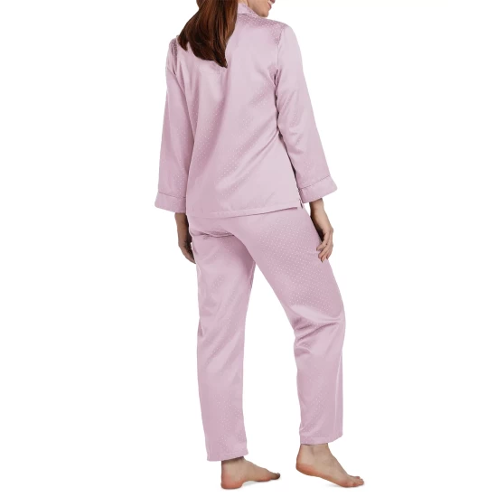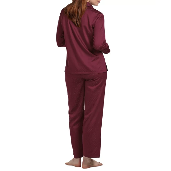 Drift off comfortably in these petite pajamas from Miss Elaine designed with a notched-collar top and matching bottoms.