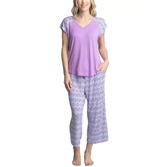 Drift off comfortably in these stylish pajamas from Miss Elaine designed with a notched-collar top and matching bottoms.